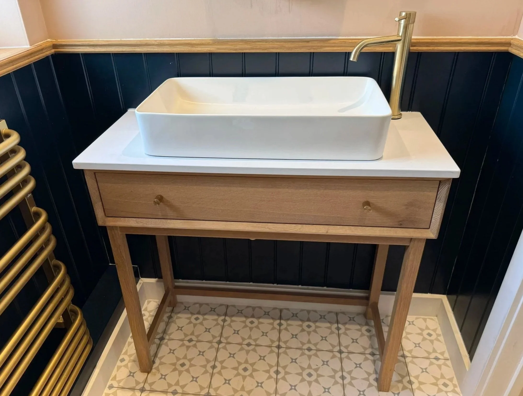 Elevate your bathroom with this exquisite solid English Oak vanity unit, crafted with precision and built to last. The rich, natural grain of the oak brings warmth and timeless elegance to any space, while the sturdy construction ensures longevity. Complemented by a sleek white Corian worktop, this unit offers a smooth, durable surface that is both hygienic and easy to clean. The brass effect tap adds a touch of sophistication, marrying classic style with modern functionality. Designed and handmade in Somerset, this bespoke piece combines integrity with exceptional craftsmanship—perfect for those seeking quality and style in their bathroom furnishings.